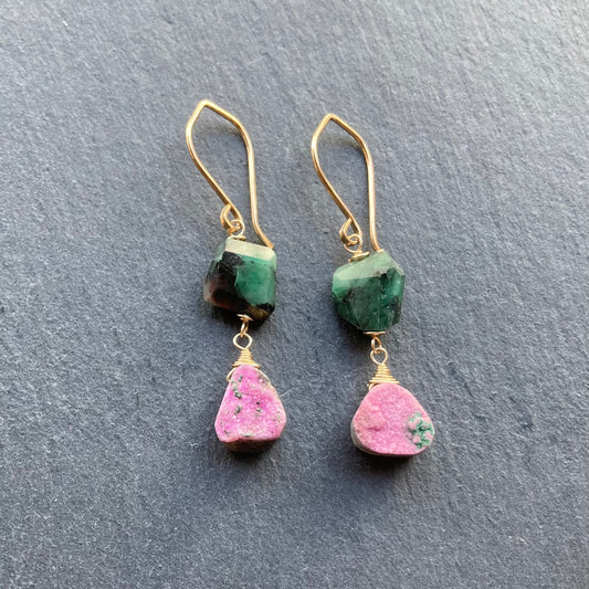 Natural Emerald, Cobalto Calcite & Gold Earrings