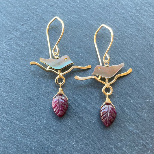 Natural Ruby, Black Mother of Pearl & Gold Plum Branch Earrings