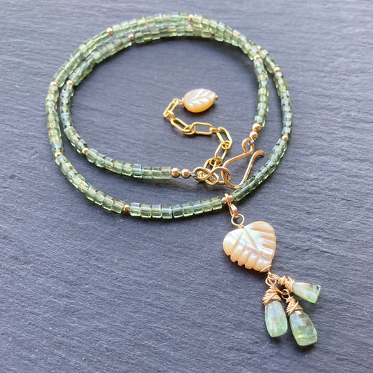Mother of Pearl, Green Apatite & Gold Palm Heart Necklace