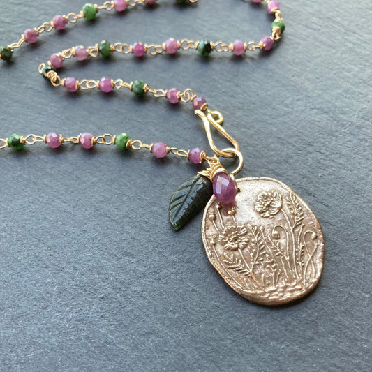 Ruby Zoisite, Gold & Bronze Poppy Garden Pendant Necklace