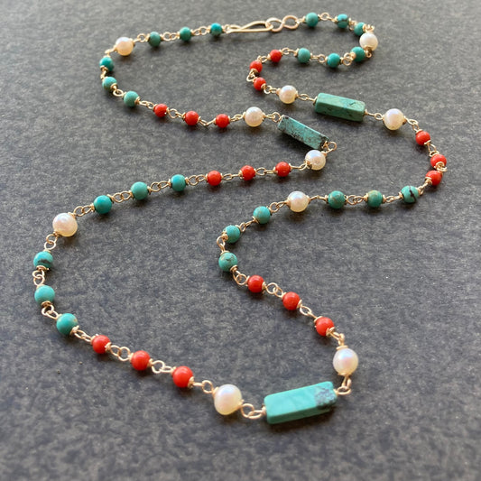 Natural Coral, Turquoise, Freshwater Pearl & Gold Necklace