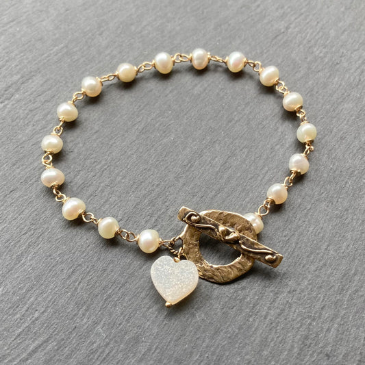 Freshwater Pearl, Gold & Bronze Heart Toggle Bracelet