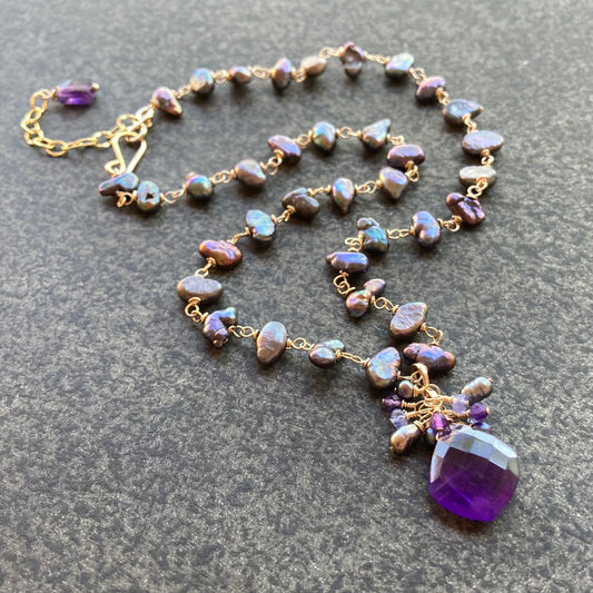 Amethyst, Freshwater Peacock Pearl & Gold Pendant Necklace