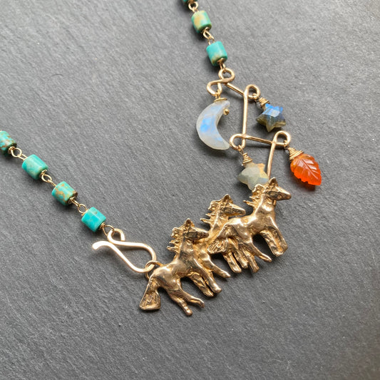 Turquoise, Gold & Bronze Wild Horses Necklace