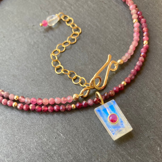 Rubelite Tourmaline & Rainbow Moonstone Pendant Necklace