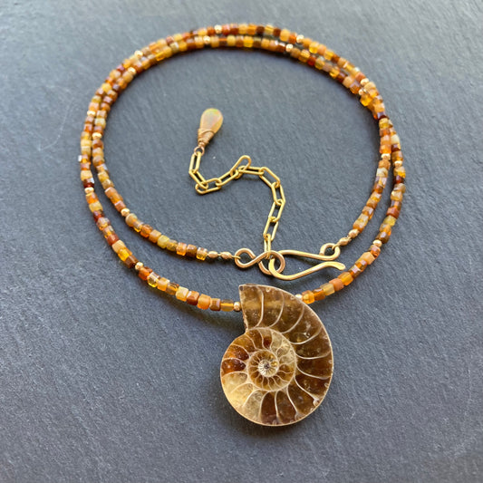 Australian Fire Opal & Gold Ammonite Pendant Choker