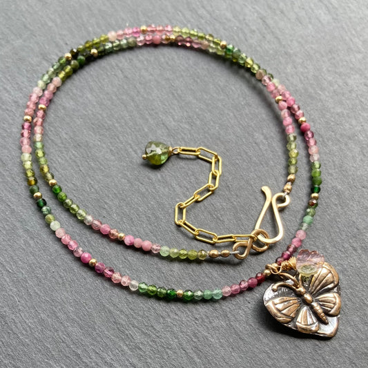 Watermelon Tourmaline, Gold & Bronze Butterfly Heart Pendant Necklace