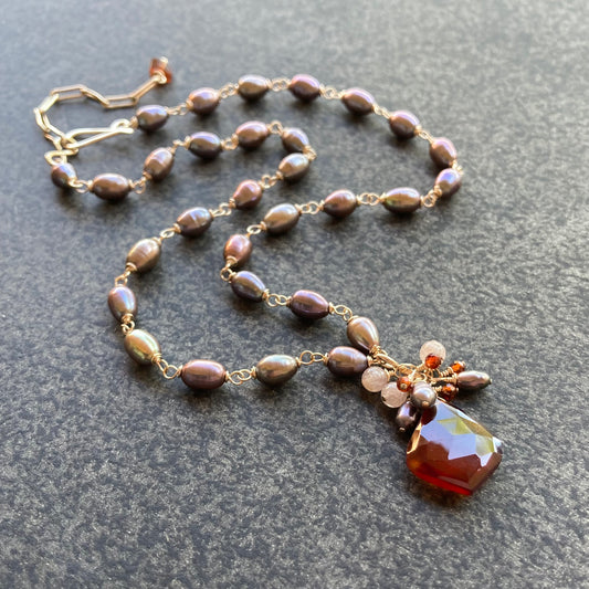 Hessonite, Purple Freshwater Pearl & Gold Pendant Necklace