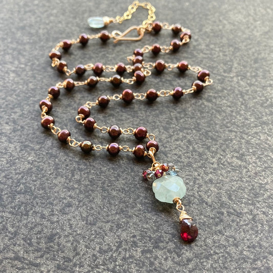 Aquamarine, Cranberry Freshwater Pearl, Rhodolite Garnet & Gold Flower Drop Pendant Necklace