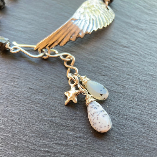 Snowflake Obsidian, Dendritic Opal & Sterling Silver Winged Goddess Bracelet