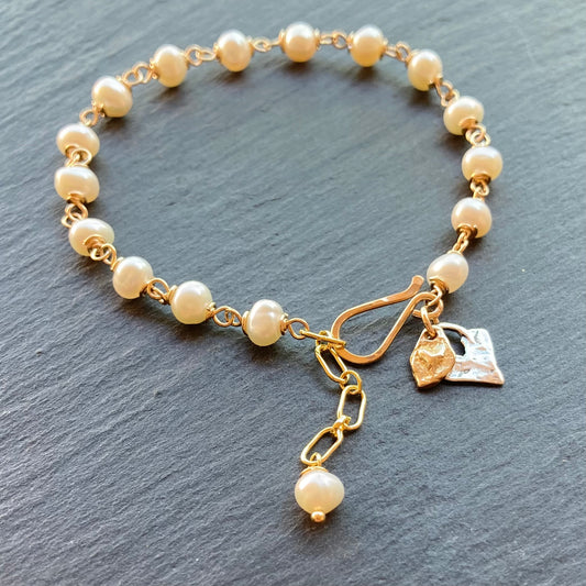 Freshwater Pearl, Gold & Mixed Metal Heart Charm Bracelet
