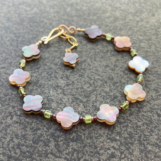 Black Mother of Pearl, Peridot, Ruby & Gold Clover Bracelet