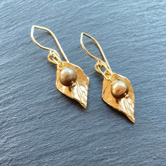 Mocha Freshwater Pearl, Gold & Bronze Leaf Earrings