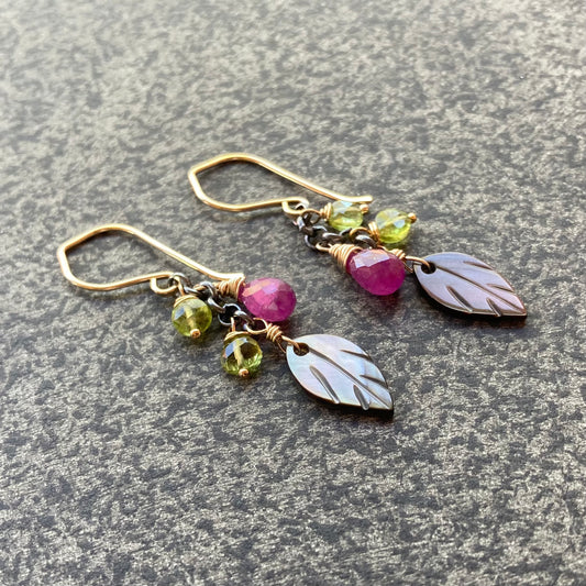 Black Mother of Pearl, Peridot, Ruby & Mixed Metal Cascade Earrings