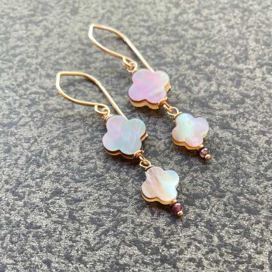 Black Mother of Pearl, Ruby & Gold Clover Earrings