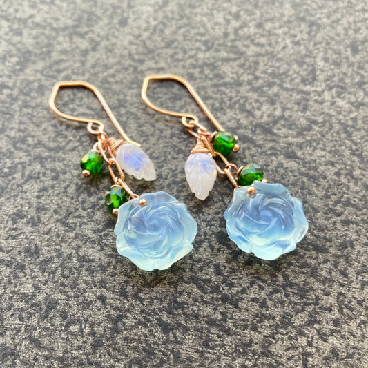 Aquamarine, Chrome Diopside, Rainbow Moonstone & Rose Gold Cascade Earrings