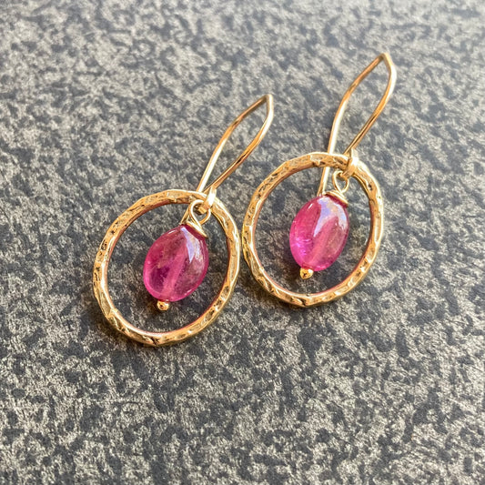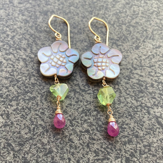 Black Mother of Pearl, Peridot, Ruby & Gold Cherry Blossom Earrings