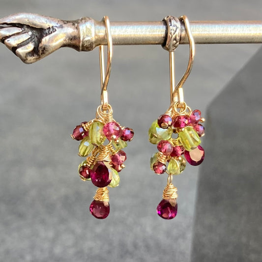 Peridot, Rhodolite, Rubelite & Gold Cascade Earrings
