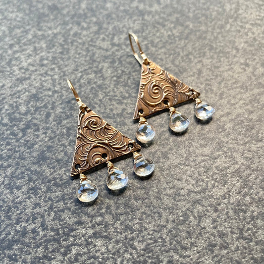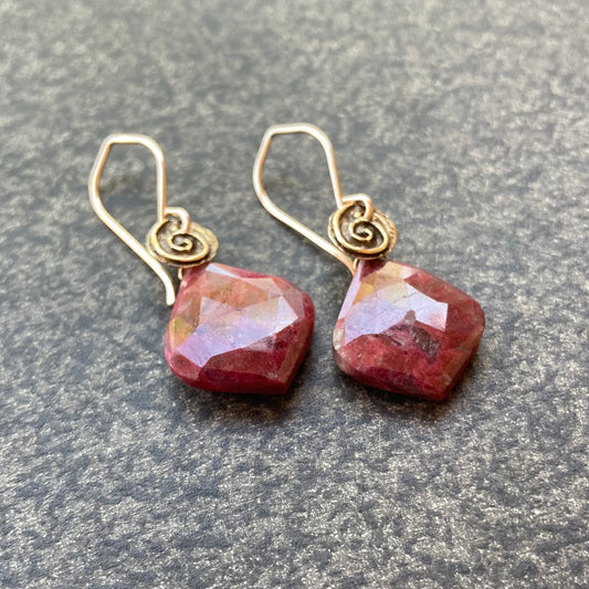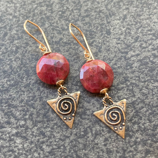 Thulite, Gold & Bronze Spiral Triangle Earrings
