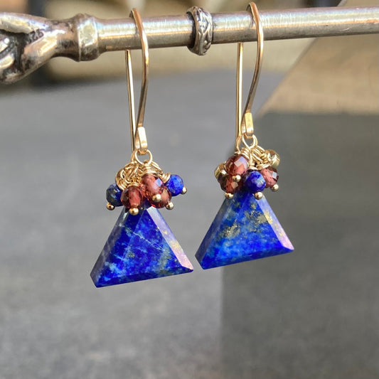 Lapis, Mozambique Garnet, Pyrite & Gold Triangle Cluster Earrings