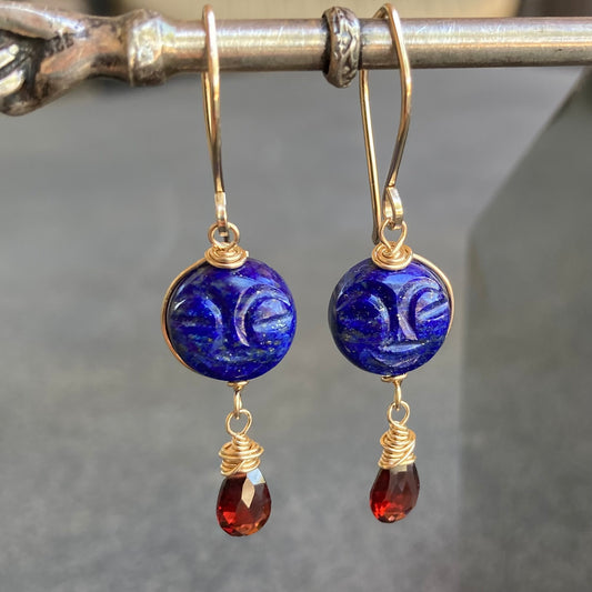 Lapis, Mozambique Garnet & Gold Full Moon Earrings