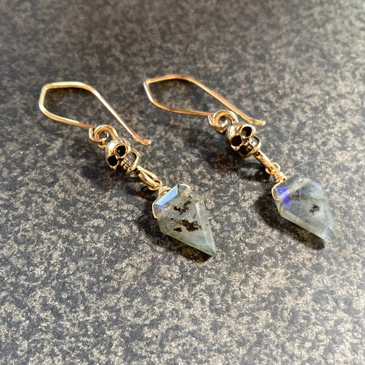 Labradorite, Gold & Bronze Skull Earrings
