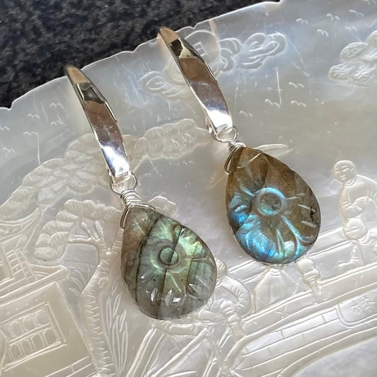 Labradorite Hand Carved Flower & Sterling Silver Marquis Earrings