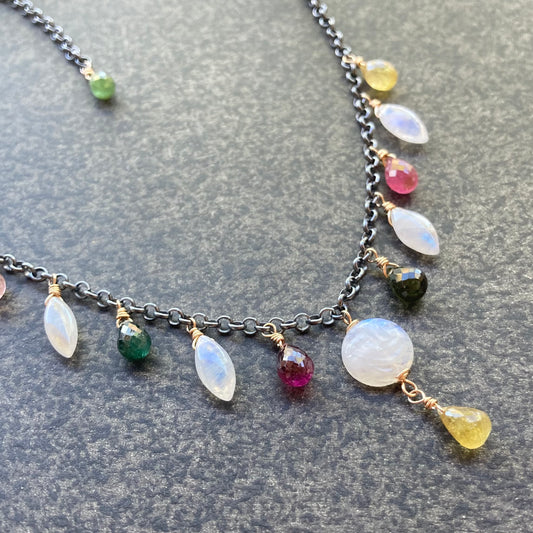 Rainbow Moonstone, Multicolor Tourmaline & Mixed Metal Full Moon Charm Choker