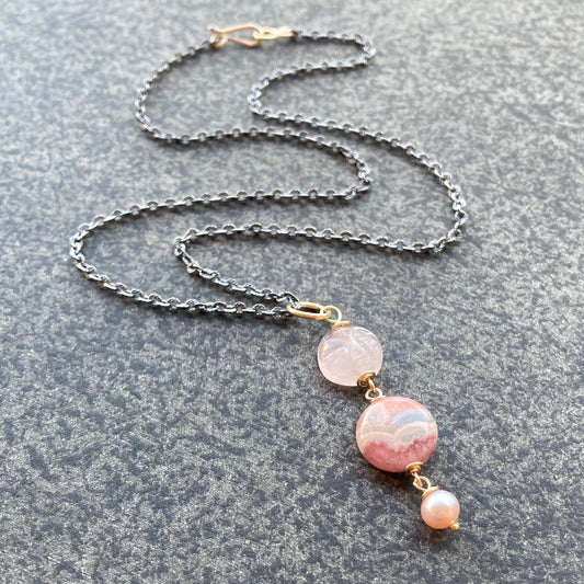 Rhodochrosite, Rose Quartz & Mixed Metal Pink Moon Rising Pendant Necklace