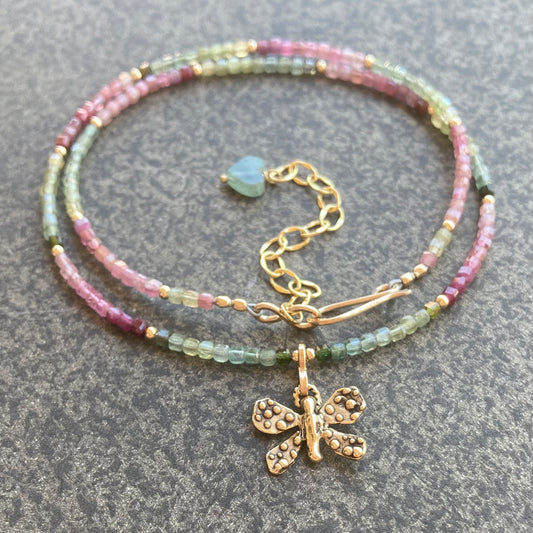 Multicolor Tourmaline, 14k Gold & Bronze Butterfly Necklace