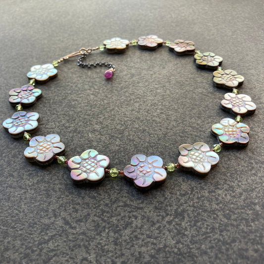 Black Mother of Pearl, Peridot, Ruby & Mixed Metal Cherry Blossom Collar