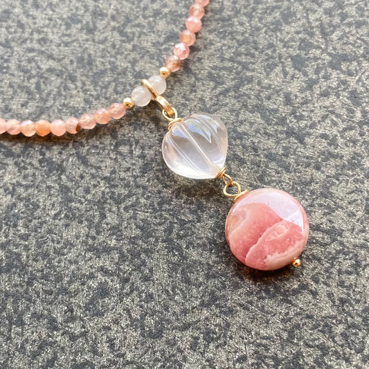 Rhodochrosite, Rose Quartz & Gold Sunrise Pendant Necklace
