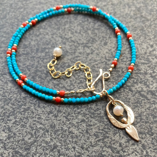 Sleeping Beauty Turquoise, Italian Coral, Gold & Bronze Goddess Pendant Choker