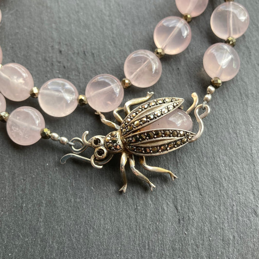 Rose Quartz, Pyrite & Vintage Marcasite Beetle Brooch Choker