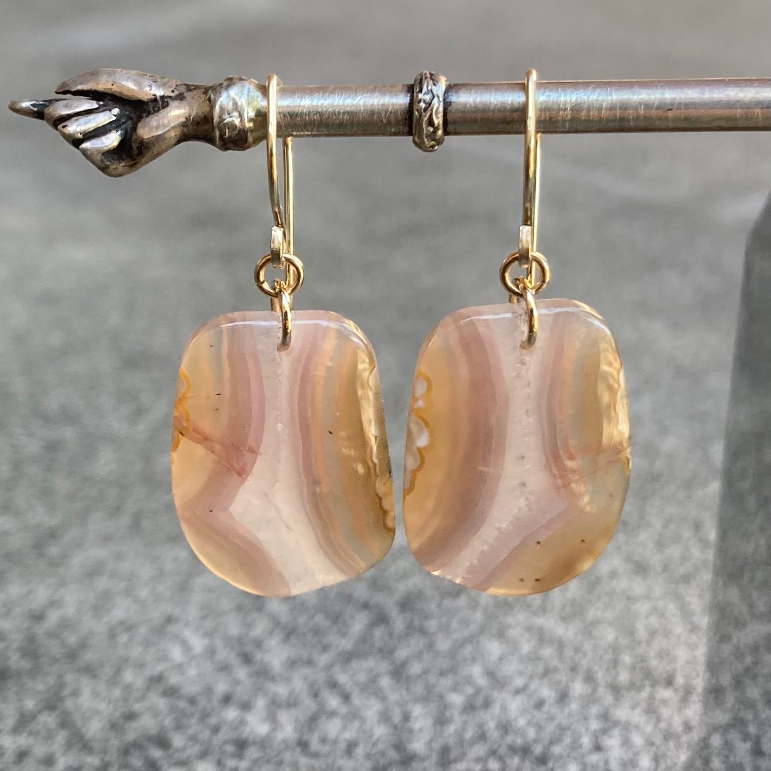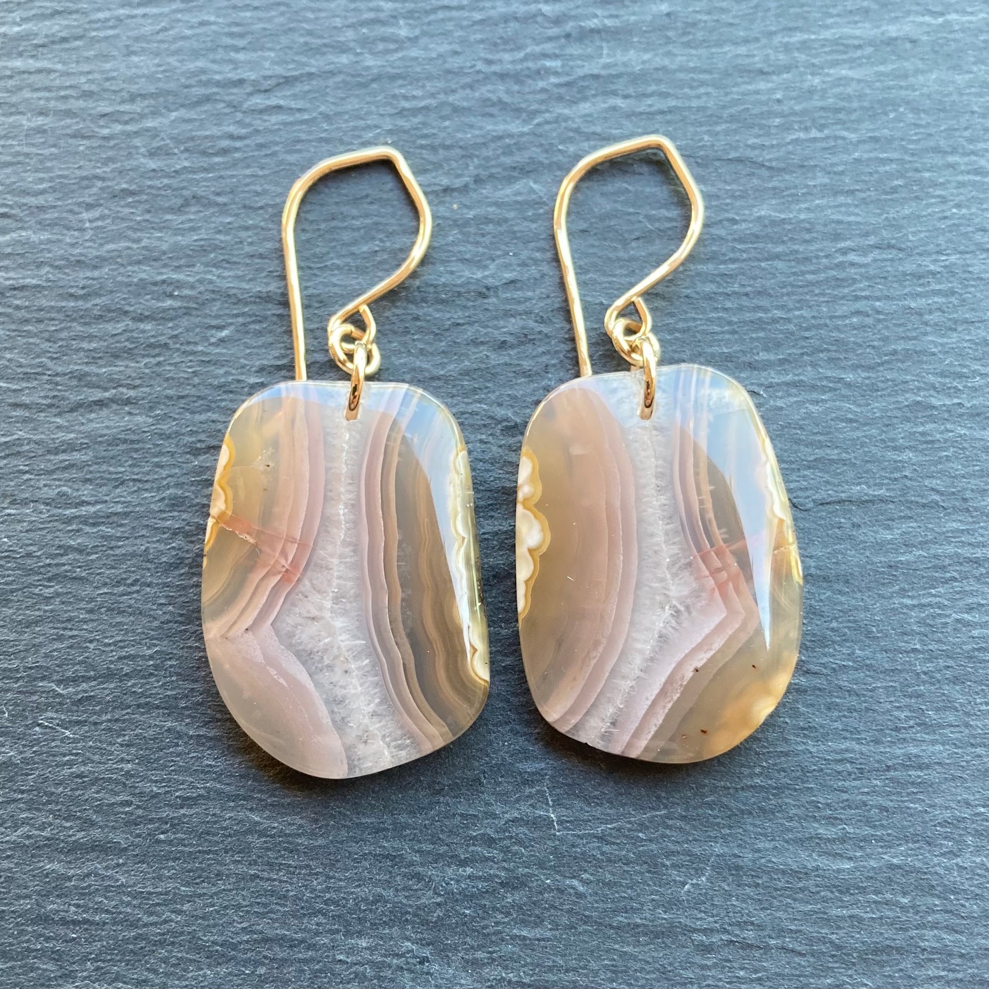 These handmade, one of a kind earrings feature rare Natural Agua Nueva Agate (Mexico) 19x28mm freeform slabs with swirls of camel tan and mauve in clear agate, suspended from 14/20 gold filled rings and are finished with my hand forged 14/20 gold filled ear wires. Earrings measure 1.75” in length and weigh 3.5grams each.