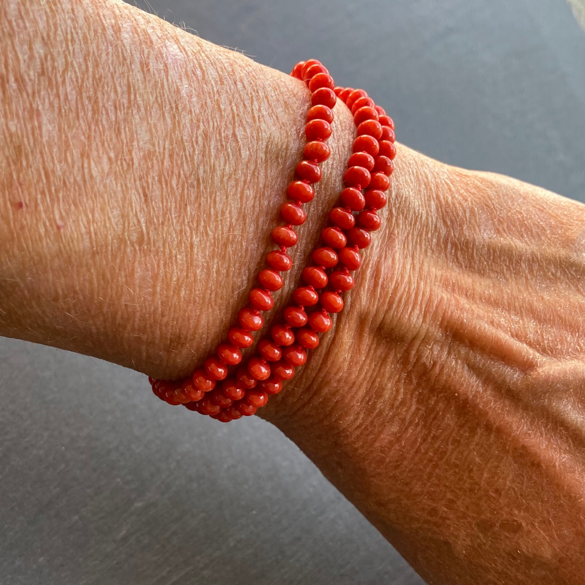 This handmade, one of a kind necklace features high quality Natural Bamboo Coral (a deep sea coral, named for its appearance similar to that of the bamboo plant on land) 4mm smooth rondelles, hand knotted on red silk cord and is finished with sterling silver hardware, including a hand forged hook clasp and 2” extension chain. Necklace measures 20-22” in length and can also double as a triple wrap bracelet for a 5.5-7” wrist, as pictured on my 6.5” wrist.