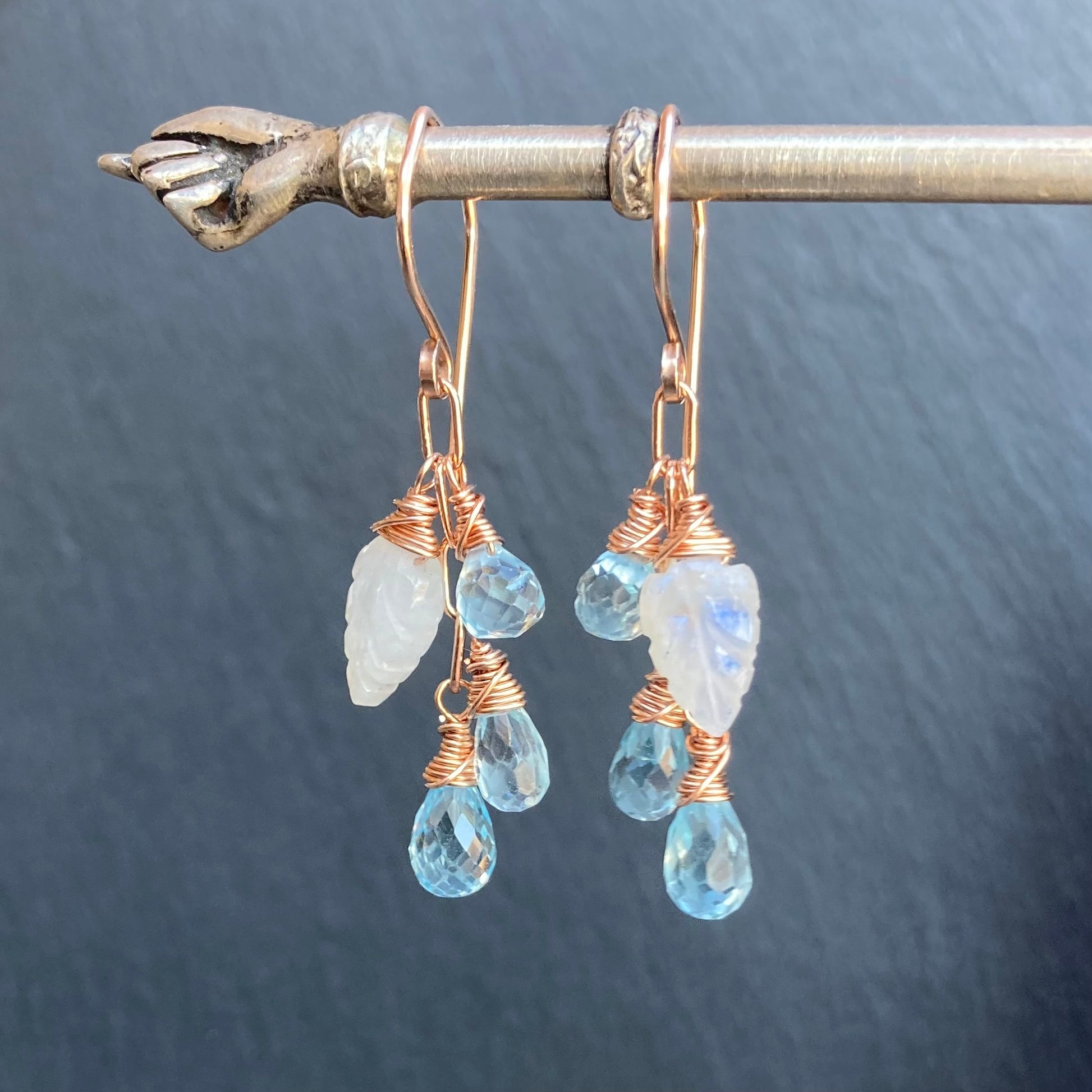 Blue Topaz, Rainbow Moonstone & Rose Gold Cascade Earrings