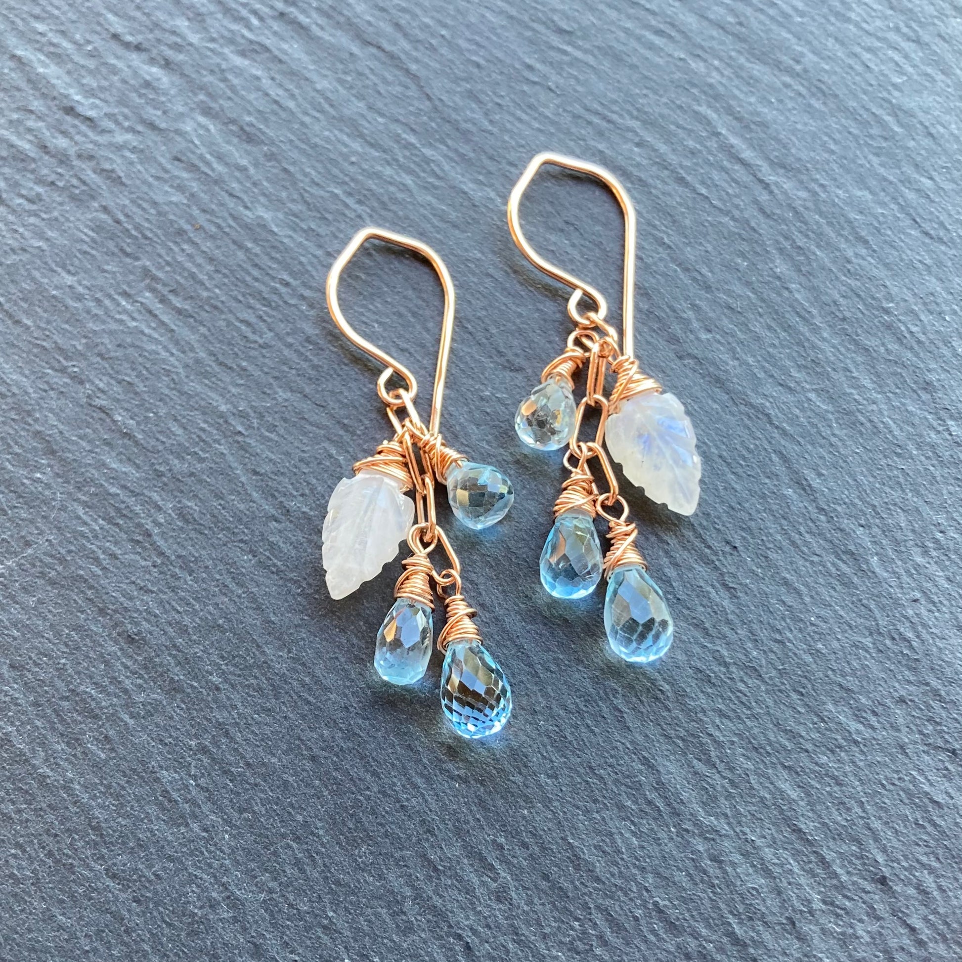These handmade, one of a kind earrings feature gorgeous Sky Blue Topaz faceted teardrop and blue fire Rainbow Moonstone hand carved leaf briolettes, hand wrapped 14k rose gold filled wire suspended from 14k rose gold filled paperclip chain and are finished with my hand forged 14k rose gold filled ear wires. Earrings measure just over 1.75” in length. Coordinating pieces listed and sold separately.