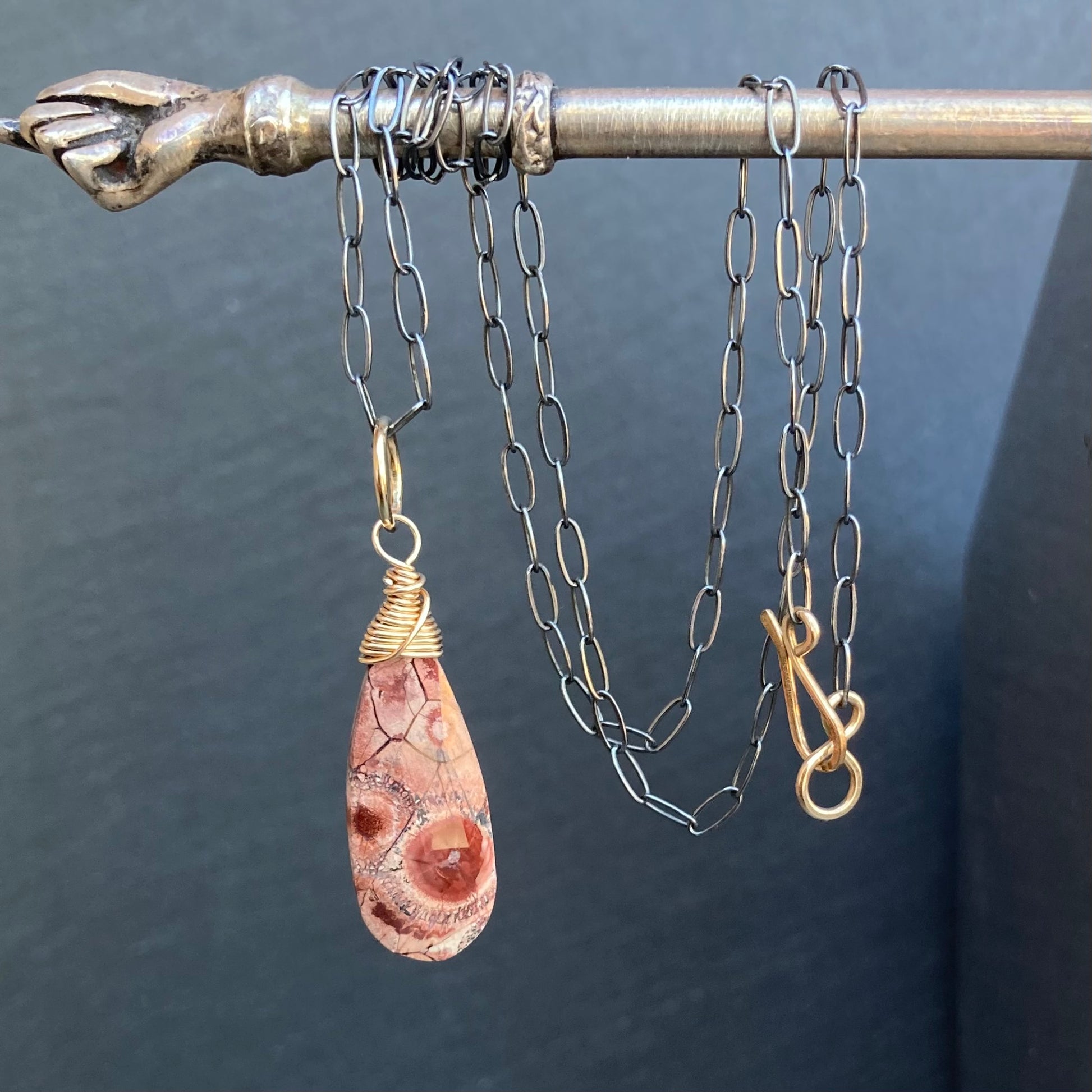 This handmade, one of a kind necklace features a maroon Natural Crazy Lace Agate hand cut, faceted 9x26mm teardrop briolette, hand wrapped in 14k gold filled wire on a 16” oxidized sterling silver dainty paperclip chain and is finished with a hand forged 14k gold filled hook and eye clasp. Coordinating pieces listed and sold separately.