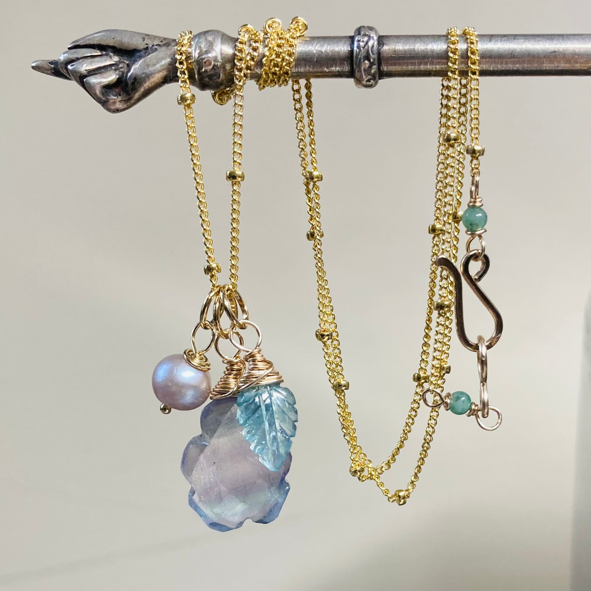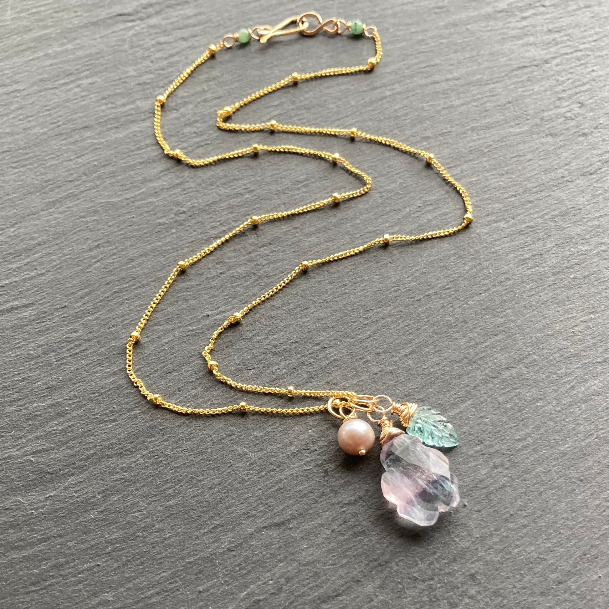 This one of a kind necklace features a banded Natural Rainbow Fluorite 13x17mm fancy briolette, a hand carved Natural Zambian Emerald leaf and a 7mm mauve Freshwater Pearl, hand wrapped in 14k gold filled wire on a 16” dainty 14k gold filled satellite chain and is finished with a hand forged hook and eye clasp. Coordinating pieces listed and sold separately.
