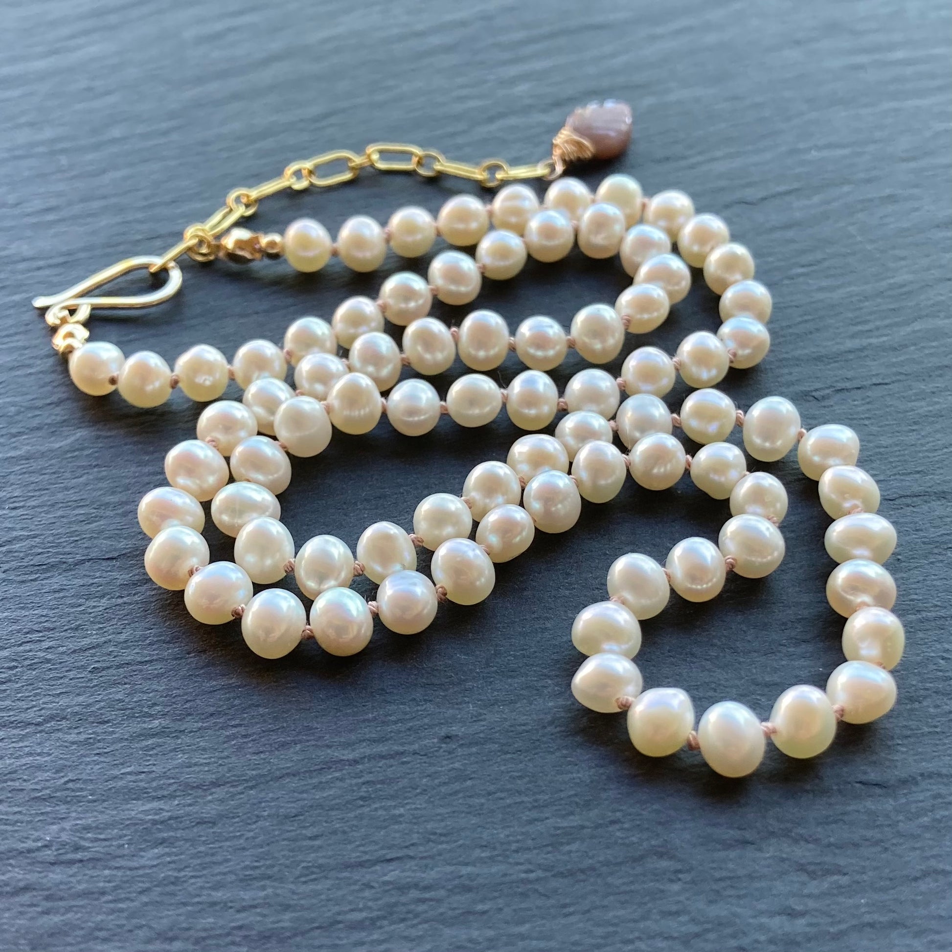 This handmade, one of a kind necklace features 5.5mm off-round, white Natural Freshwater Pearls hand knotted on blush pink silk cord and is finished with 14k gold filled hardware including a hand forged hook clasp and 2” extension chain with a Chocolate Moontone hand carved leaf charm. Necklace is adjustable from 19-21” in length. Coordinating pieces listed and sold separately.