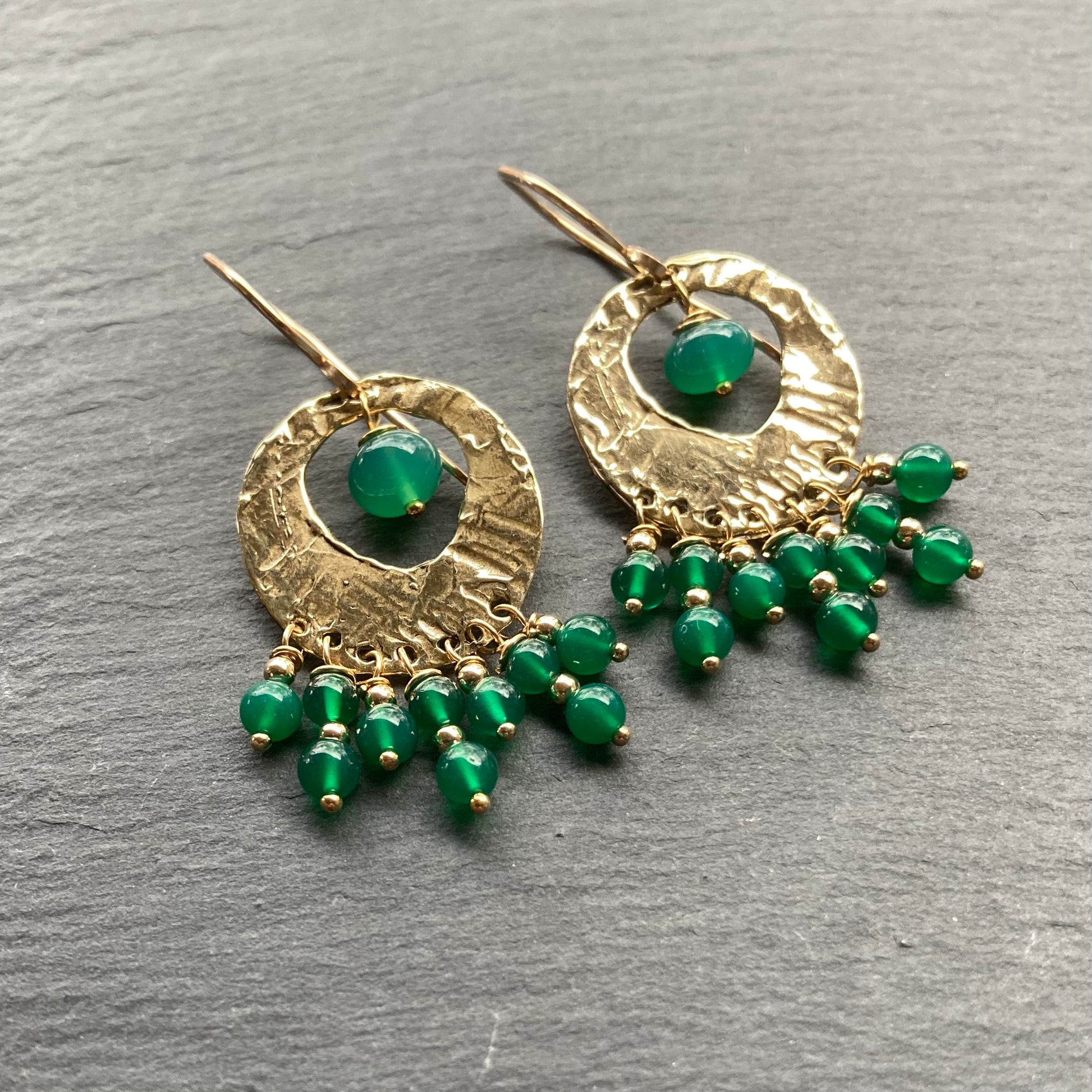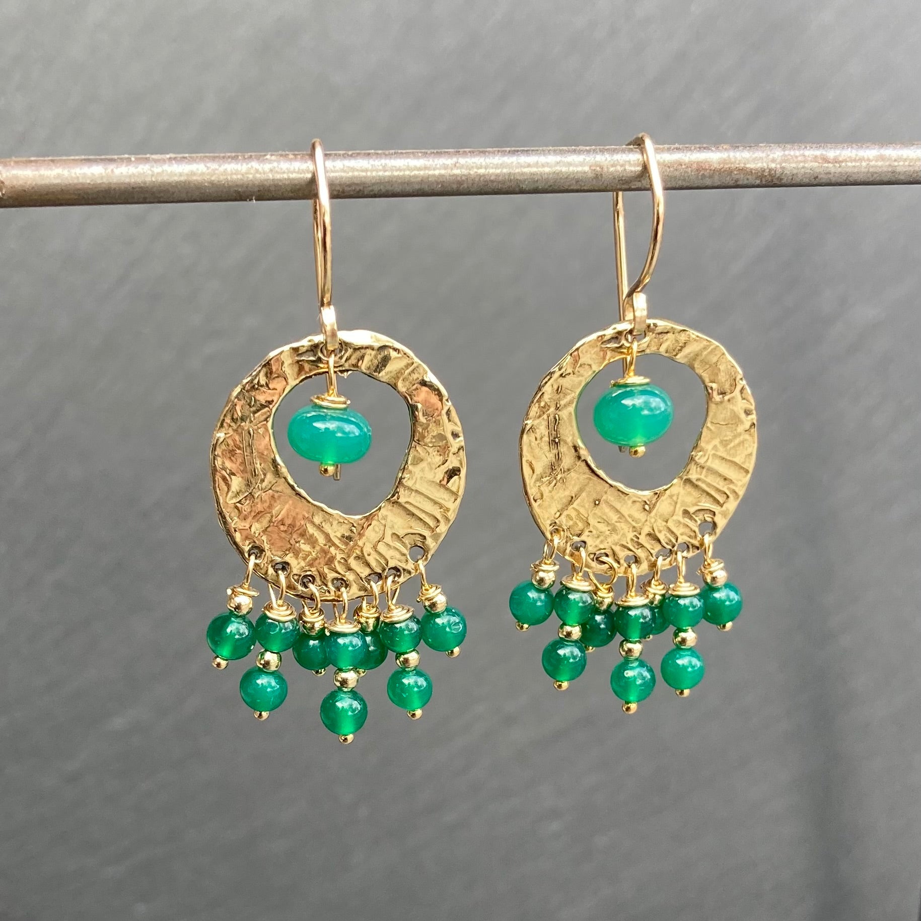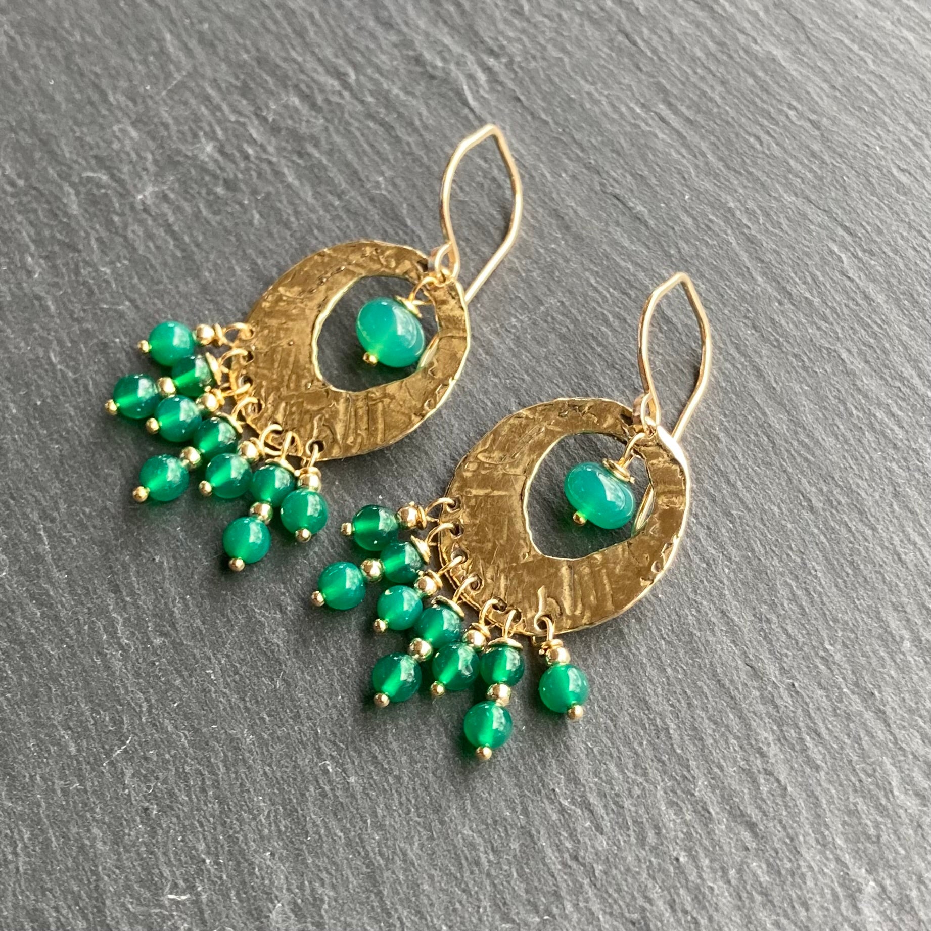 These handmade, one of a kind earrings feature Green Onyx smooth rounds and rondelles and 14k gold filled seamless rounds, hand wrapped in 14k gf wire hanging from artisan bronze 20mm round hoops and are finished with my hand forged 14k gold filled ear wires. Earrings measure 1.75” in length. Coordinating pieces listed and sold separately.