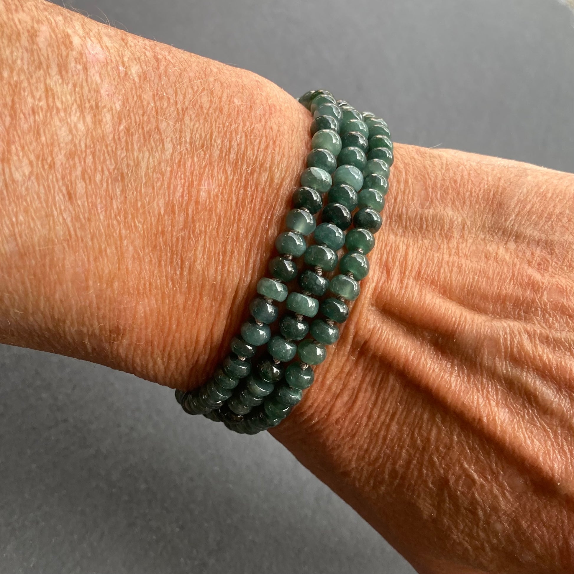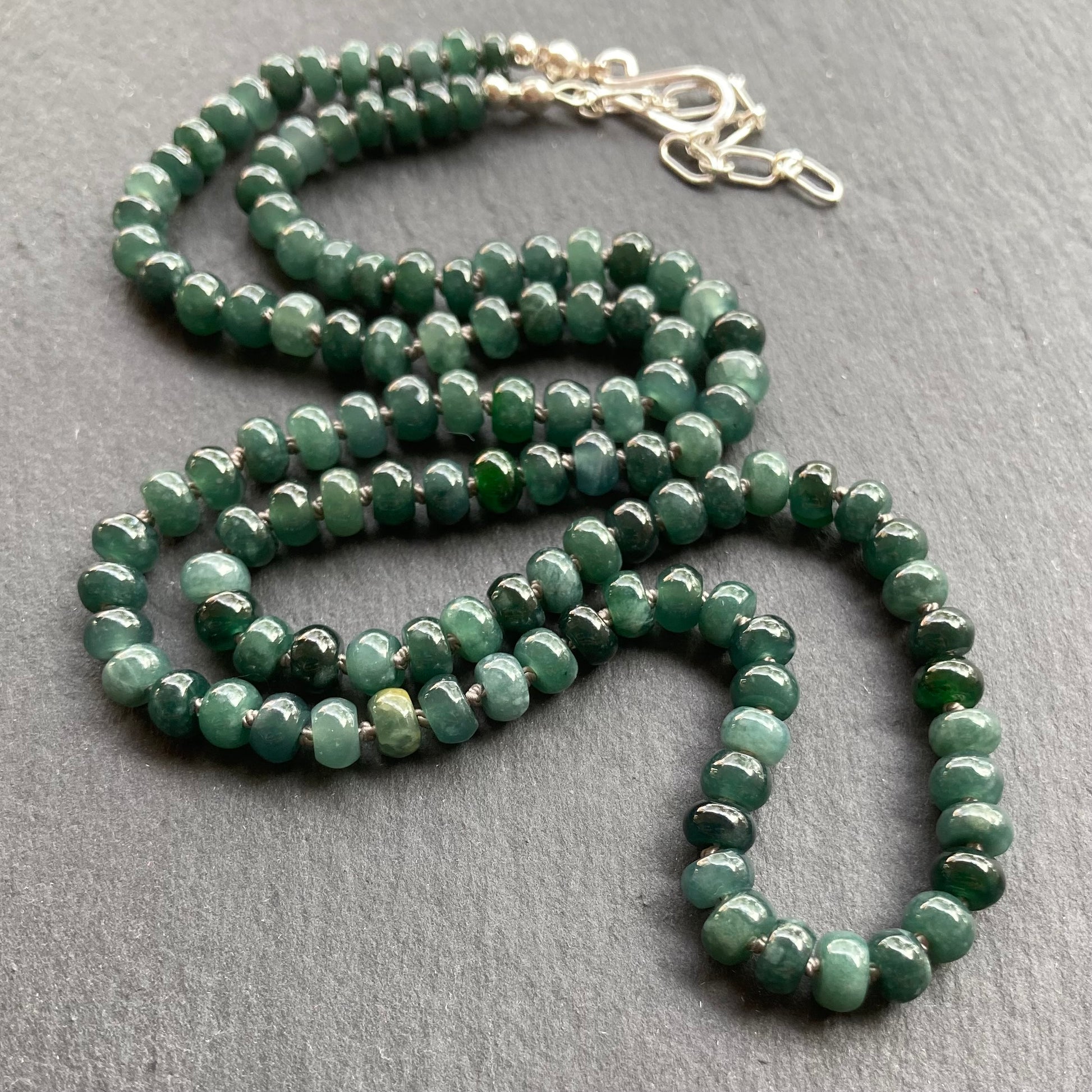 This handmade, one of a kind necklace features gorgeous, teal AAA Natural Guatemalan Jade 5-5.5mm smooth rondelles that I’ve hand knotted on grey silk cord and finished with sterling silver hardware, including a hand forged hook clasp and 2” extension chain. Necklace measures 21-23“ in length and can double as a triple wrap bracelet for up to a 7” wrist (as shown on my 6.5” wrist).