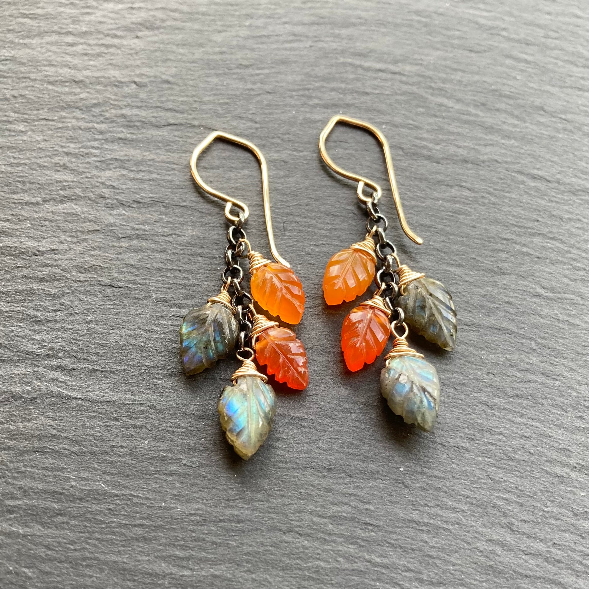 These handmade, one of a kind earrings feature fiery Labradorite and vibrant orange Carnelian hand carved leaves, hand wrapped in 14k gold filled wire, suspended from oxidized sterling silver Rolo chain and are finished with my hand forged 14k gold filled ear wires. Earrings measure 2” in length. Coordinating pieces listed and sold separately.