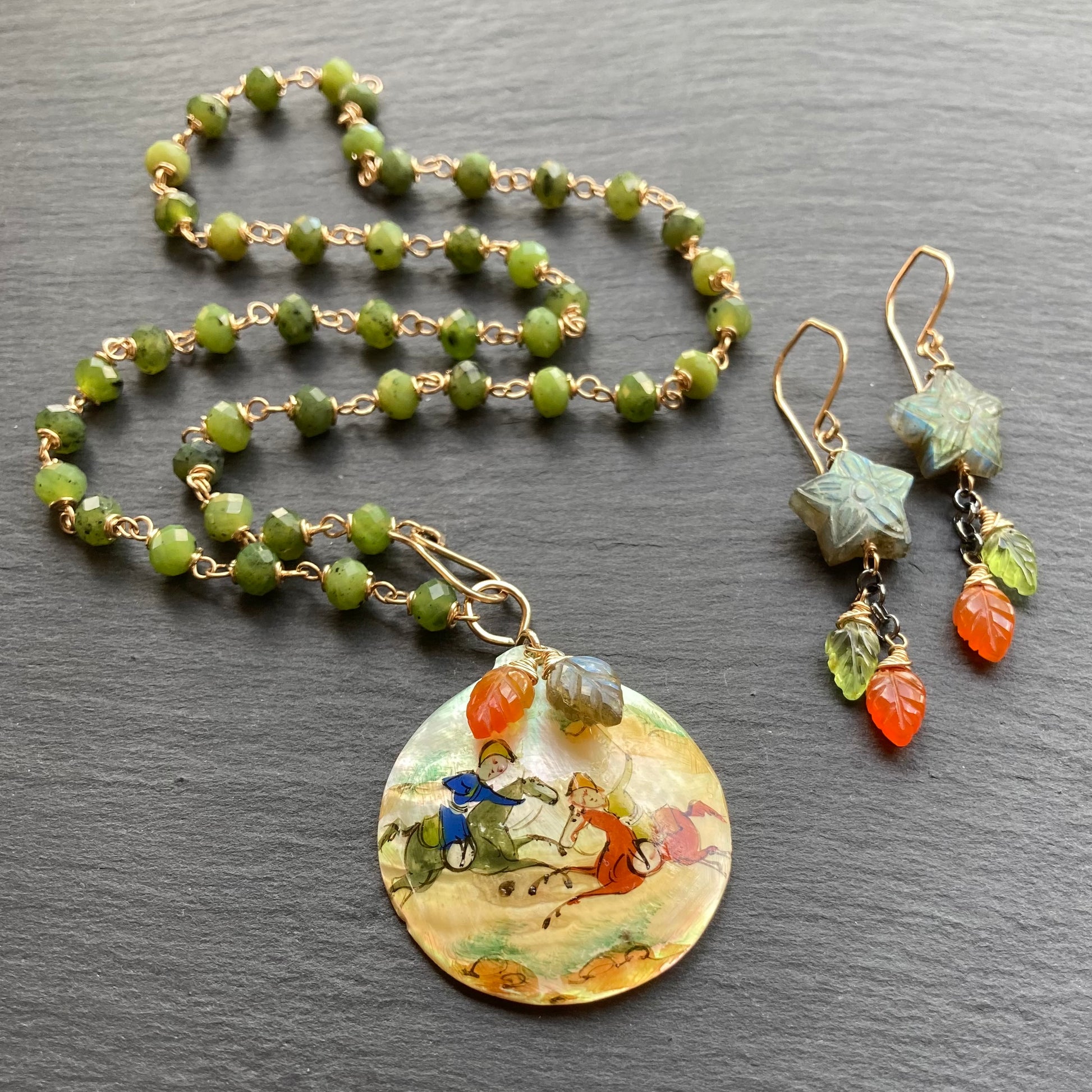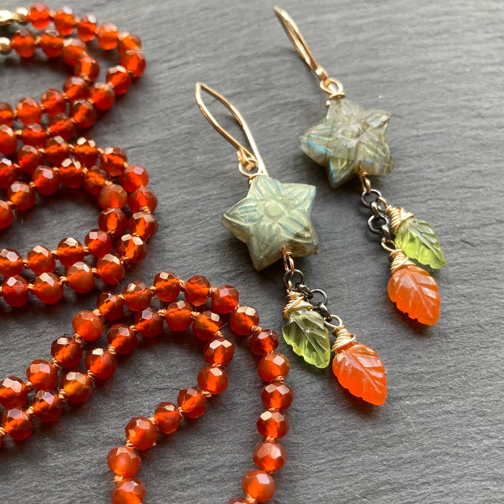 These handmade, one of a kind earrings feature fiery Labradorite 14mm hand carved Star flowers and vibrant orange Carnelian and apple green Peridot hand carved leaves, hand wrapped in 14k gold filled wire, suspended from oxidized sterling silver Rolo chain and are finished with my hand forged 14k gold filled ear wires. Earrings measure 2 1/8” in length. Coordinating pieces listed and sold separately.