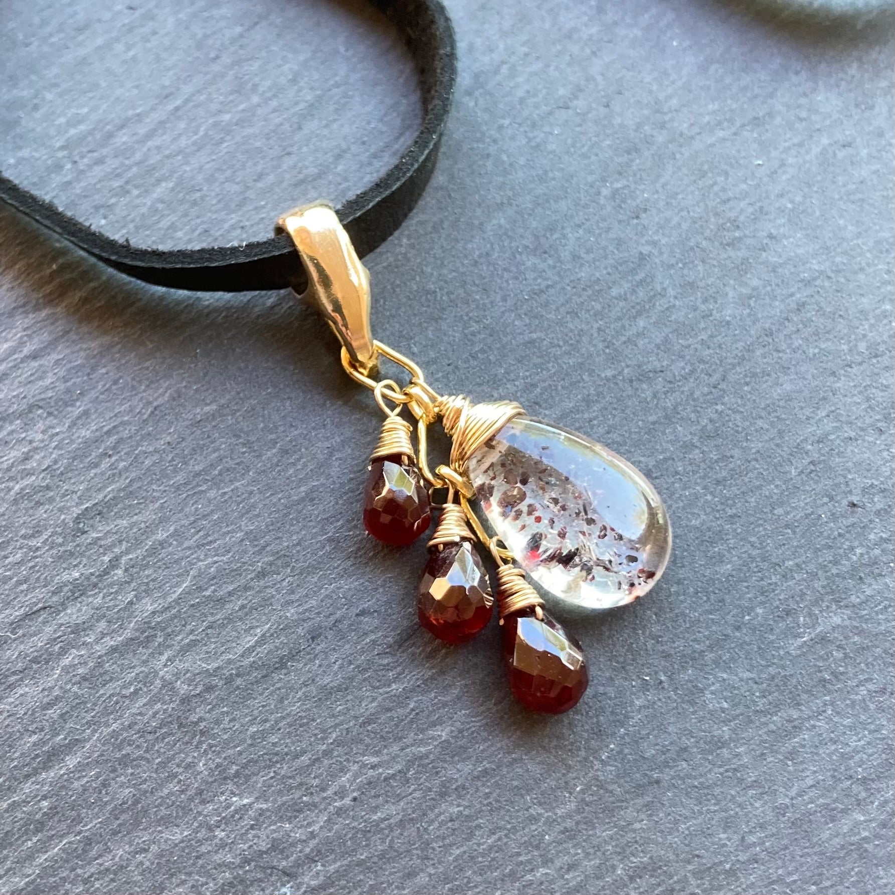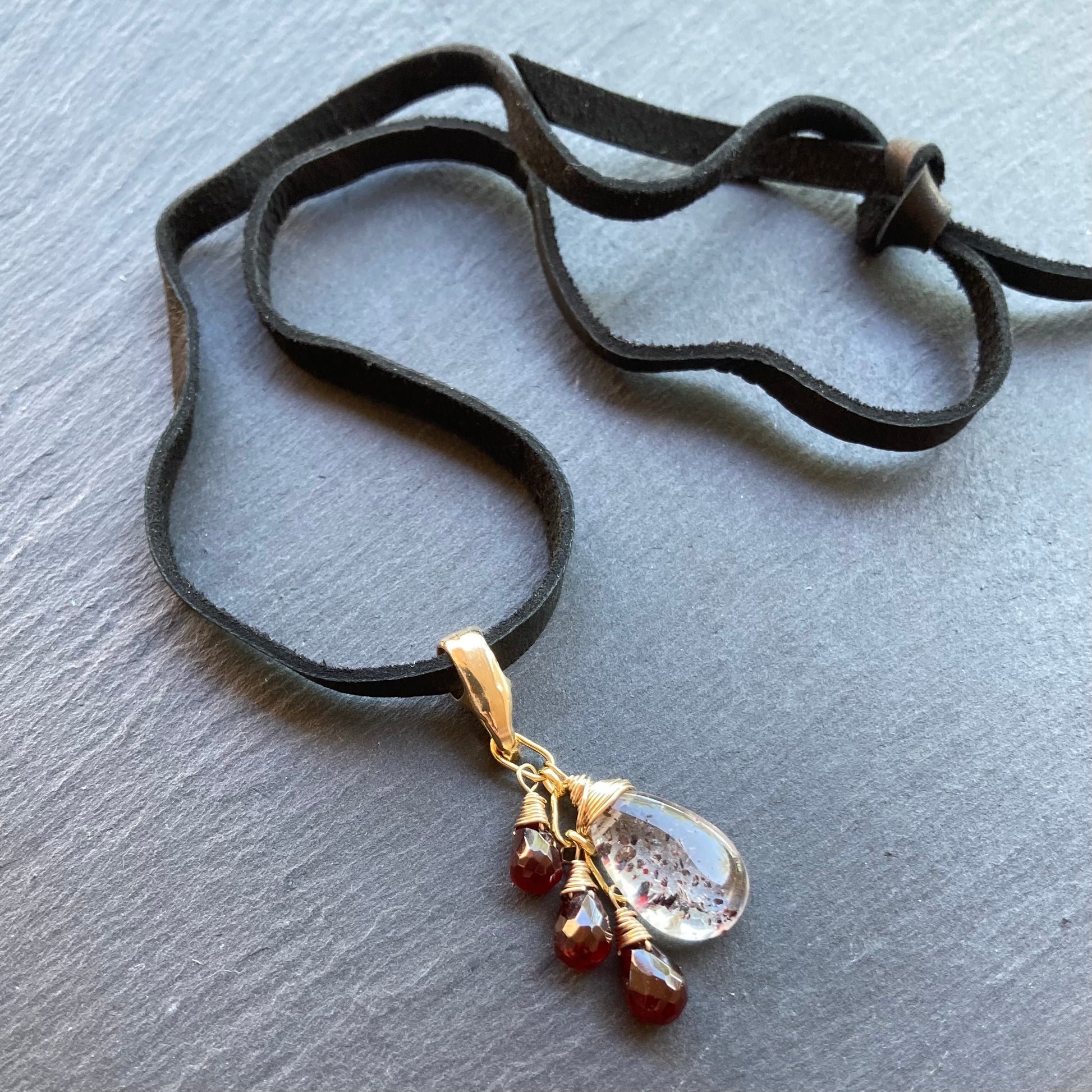 This handmade, one of a kind choker features a Lepidocrocite (a clear Quartz with red to black iron inclusions) smooth pear briolette and red Mozambique Garnet faceted teardrops, hand wrapped in 14/20 gold filled wire on 14/20gf chain suspended from an artisan bronze bail on a 21” 5mm wide black Deertan leather lace. Choker can be tied to your desired length up to 18”. Coordinating pieces listed and sold separately.
