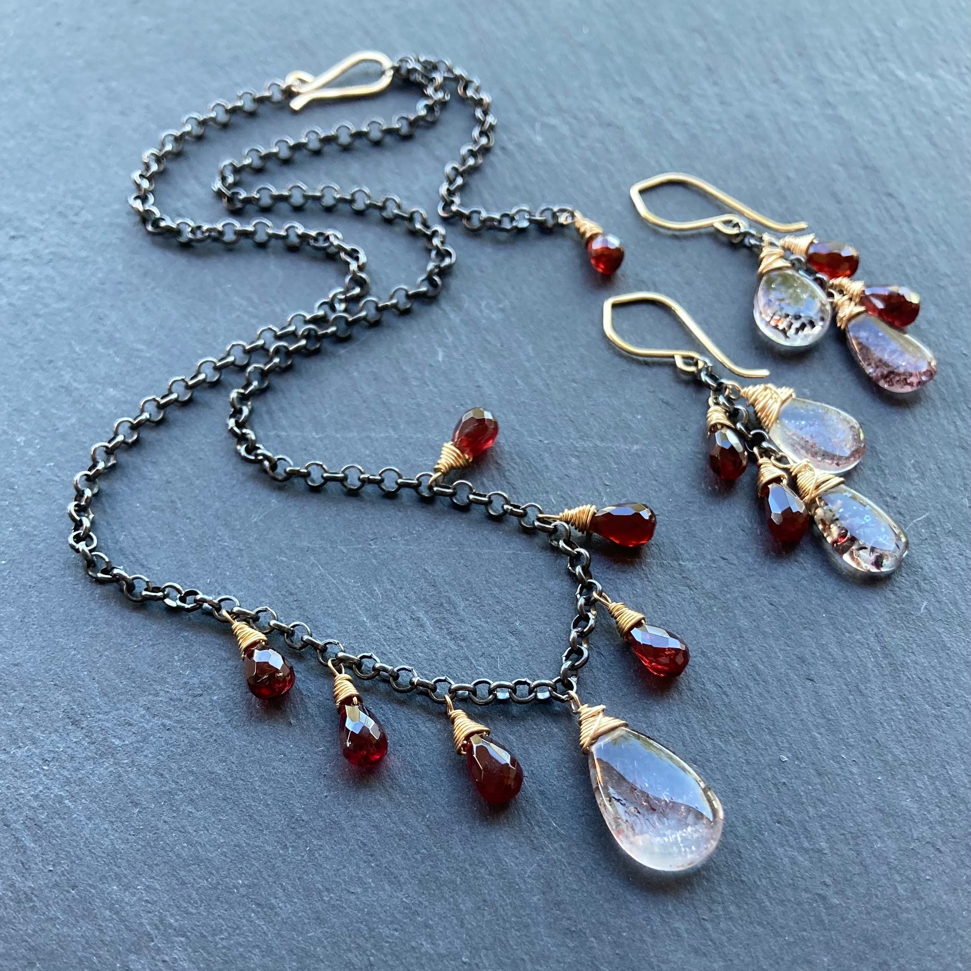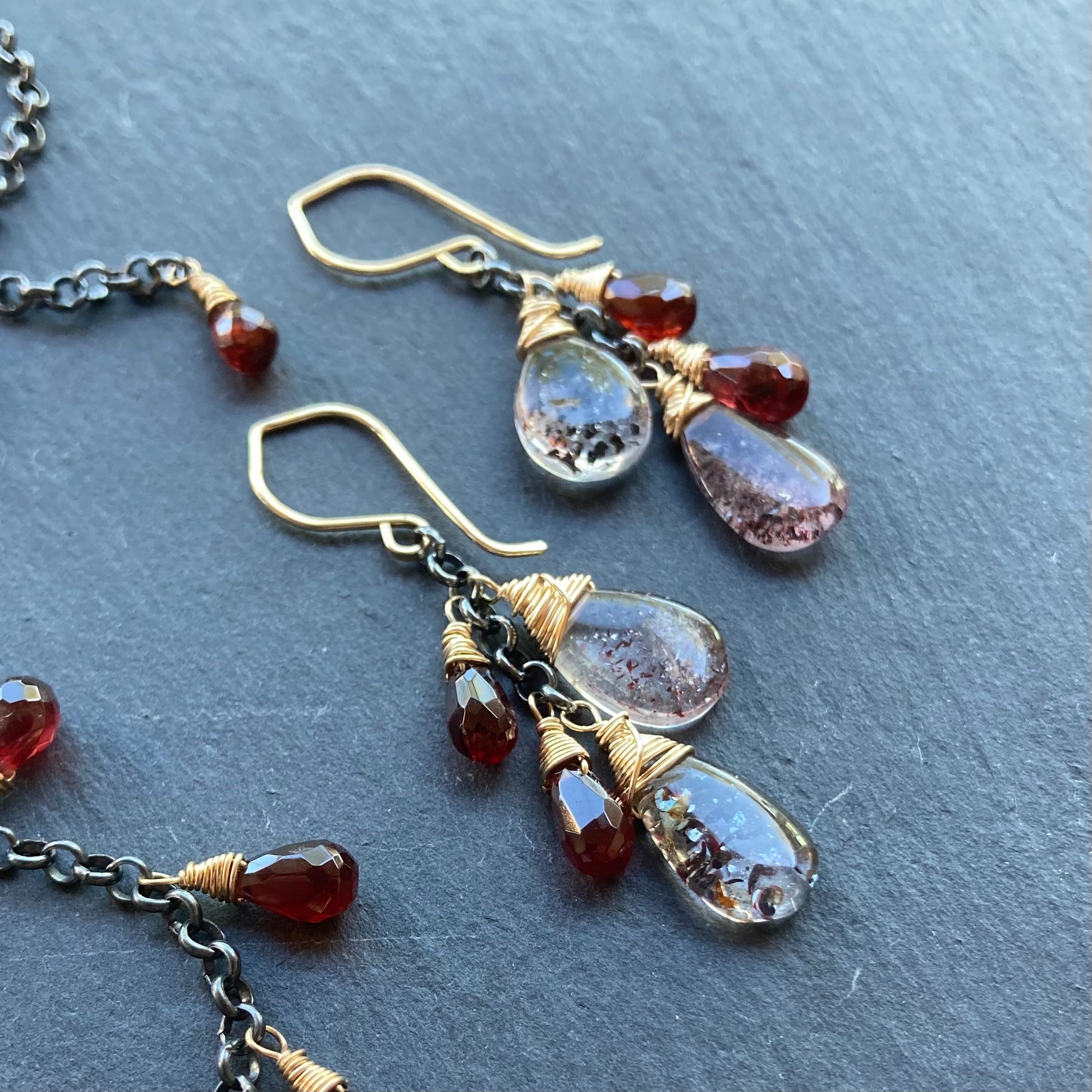 These handmade, one of a kind earrings feature Lepidocrocite (a clear Quartz with red to black iron inclusions) smooth pear briolettes and red Mozambique Garnet faceted teardrops, hand wrapped in 14/20 gold filled wire, suspended from oxidized sterling silver rolo chain and are finished with my hand forged 14k gold filled ear wires. Earrings measure 2” in length. Coordinating pieces listed and sold separately.