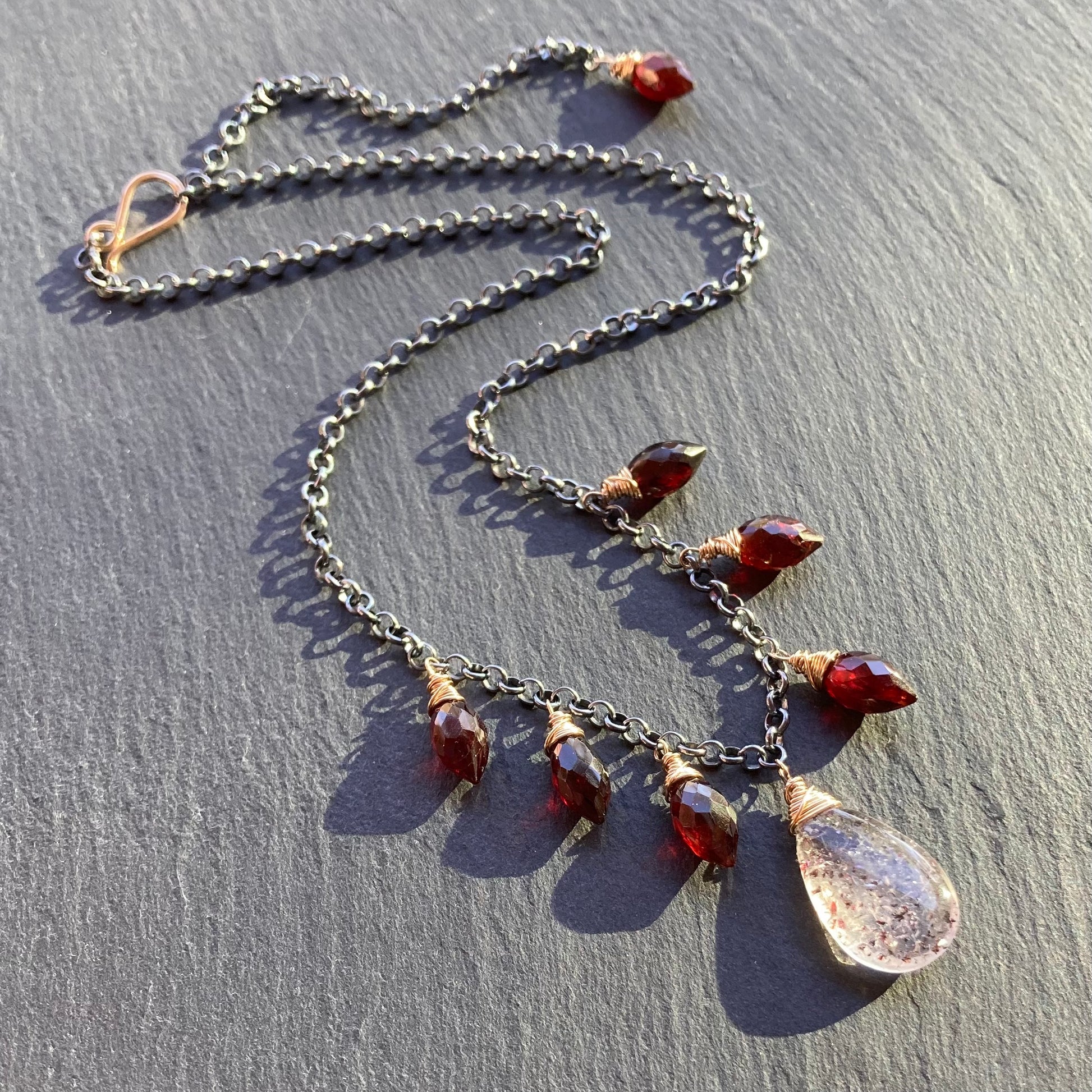 This handmade, one of a kind charm choker features a rare Lepidocrocite (a clear Quartz with red and black hematite inclusions) 13x23mm smooth pear briolette paired with dark red Mozambique Garnet faceted marquis briolettes, hand wrapped in 14k gold filled wire, suspended from an oxidized sterling silver Rolo chain and is finished with a hand forged 14k gold filled hook clasp. Necklace is adjustable to 18” in length. Coordinating pieces listed and sold separately.