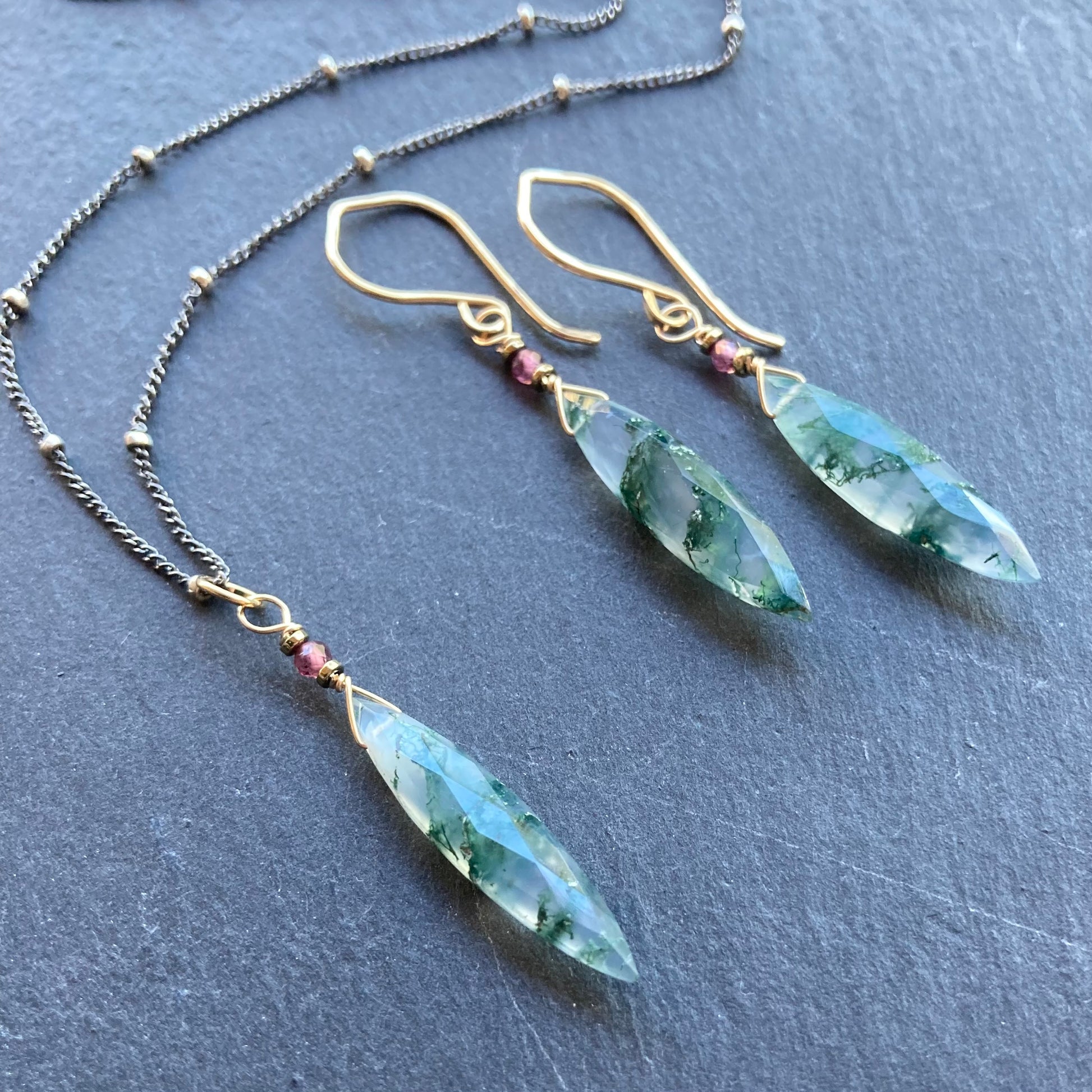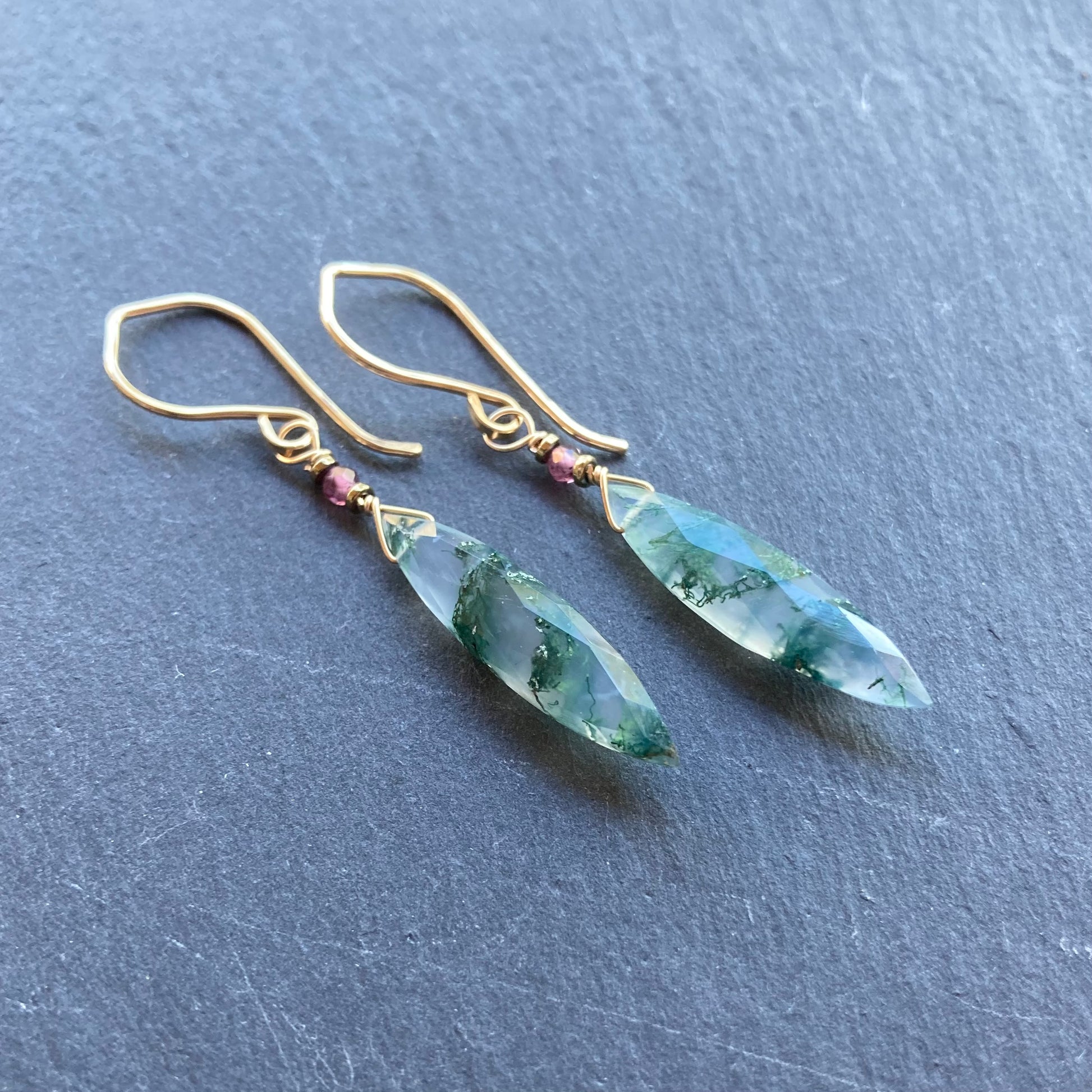 These handmade, one of a kind earrings feature AAA Natural Moss Agate 5x25mm hand cut, faceted Marquis briolettes, rose pink Rhodolite Garnet microfaceted rondelles and metallic Titanium Pyrite heishi beads, hand wrapped in 14k gold filled wire and are finished with my hand forged 14k gold filled ear wires. Earrings measure just over 1 7/8” in length. Coordinating pieces listed and sold separately.