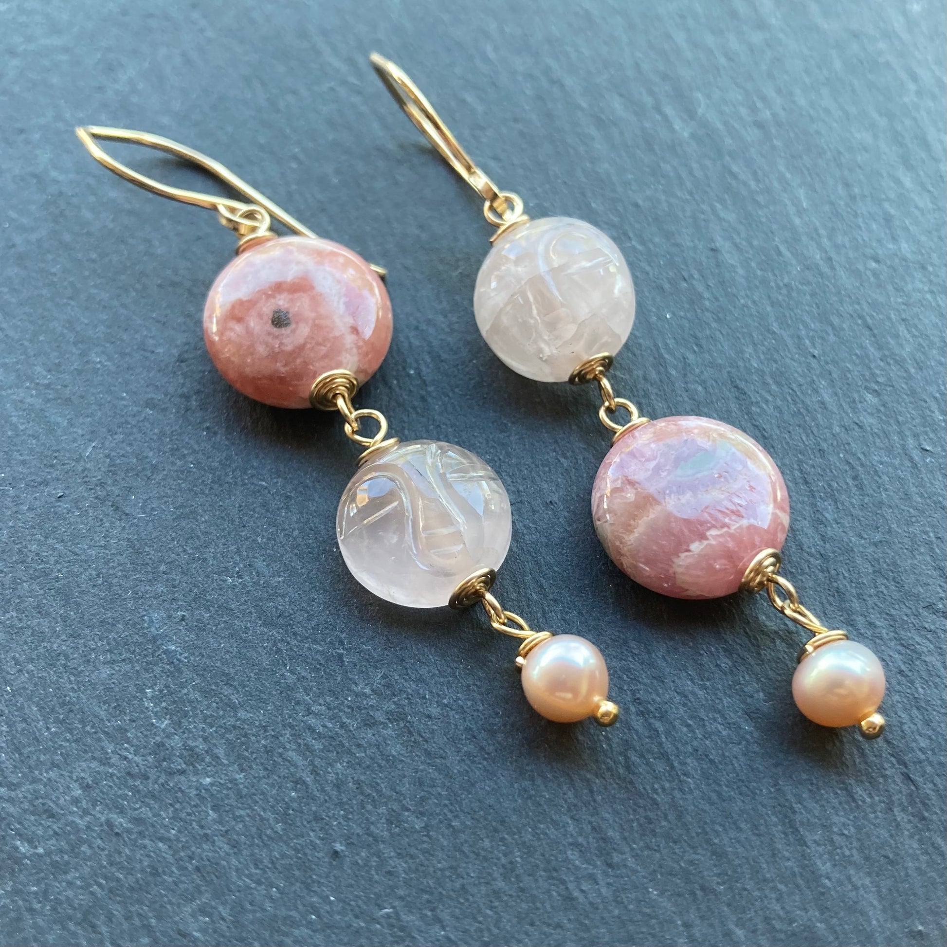 These handmade, one of a kind earrings feature pink Rose Quartz 11mm hand carved full moon faces, AAA Natural Rhodochrosite 12mm smooth coins and blush pink Natural Lahaina Pearls, hand wrapped in 14k gold filled wire and are finished with my hand forged 14k gold filled ear wires. Earrings measure just over 2.25” in length. Coordinating pieces listed and sold separately.